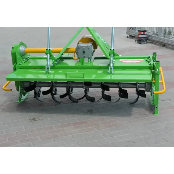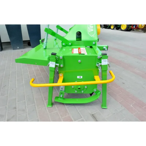 Il y a des disques montés sur le rotor de travail avec un pas de 225 mm, auxquels sont fixés les couteaux. Le motoculteur est équipé d'un rabat arrière traditionnel articulé qui limite les projections de terre et de pierres. Le fait de relever la couverture réduit la fragmentation du sol, tandis que l'abaisser augmente la fragmentation lorsque les particules de sol frappent la couverture.