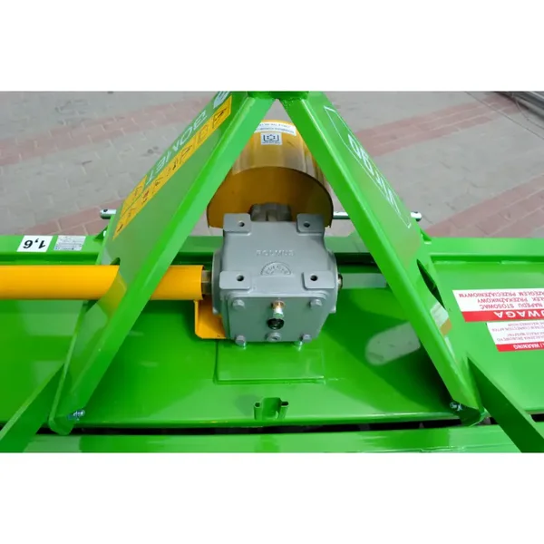 La profondeur de travail (12 cm) est réglée à l'aide de patins latéraux ou de roues de palpage. Un paramètre très important de la machine est la vitesse de rotation de l'arbre de coupe, qui est de 265 tr/min. L'équipement standard comprend un arbre de prise de force avec un embrayage de surcharge pour augmenter la durabilité et la fiabilité de la transmission.