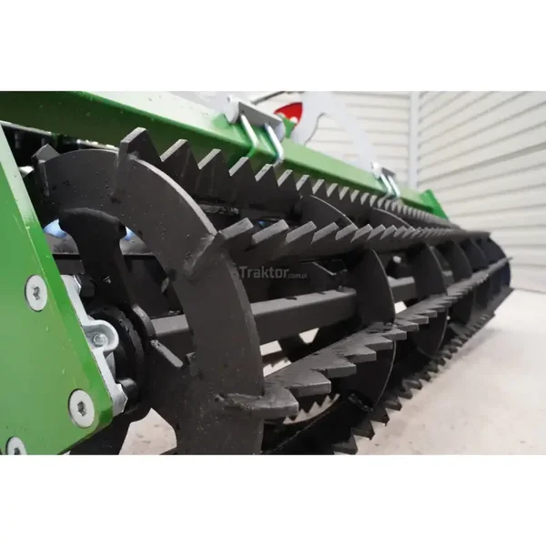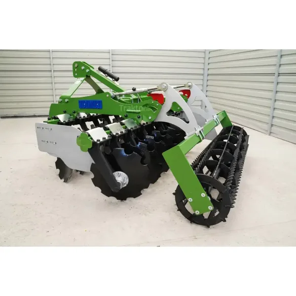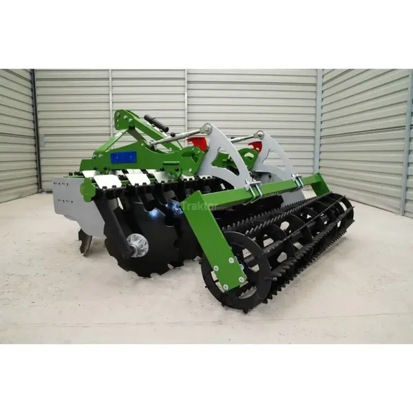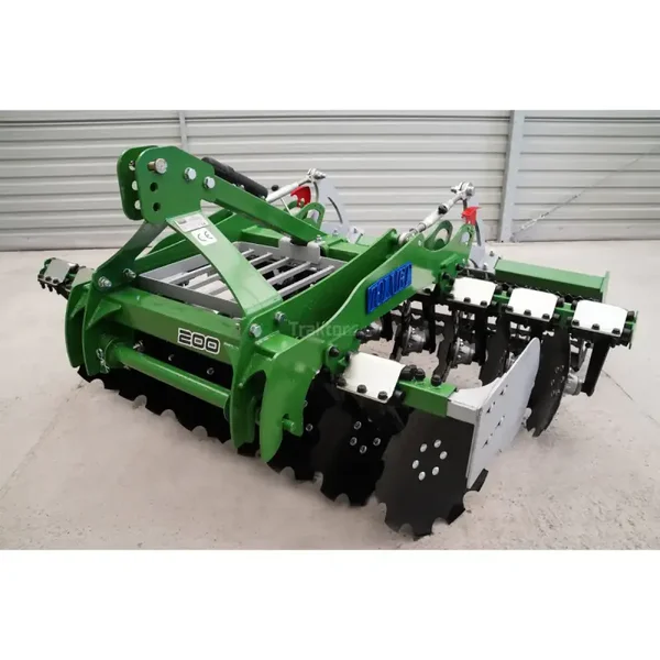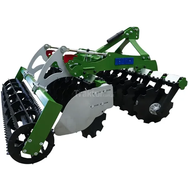 La herse à disques Simply 200 cm Tolmet est équipée de 16 disques dentés (2 x 8) d'un diamètre de 510 mm et d'un rouleau à chaîne arrière d'un diamètre de 440 mm avec roulements. Les disques sont montés sur deux rangées sur des coussinets en caoutchouc. L'espacement entre les poutres de disques est de 800 mm. Ce modèle de herse travaillera à une largeur de travail de 200 M. Cette herse nécessite le raccordement à un tracteur agricole d'une puissance minimale de 60 CV. Il dispose d'un timon automatique. Pour de meilleurs résultats de travail, le déchaumeur à disques peut être lesté ; un panier pour les poids est inclus dans le kit. L'avantage de ce modèle de herse est le rouleau à ficelle inclus dans l'ensemble.